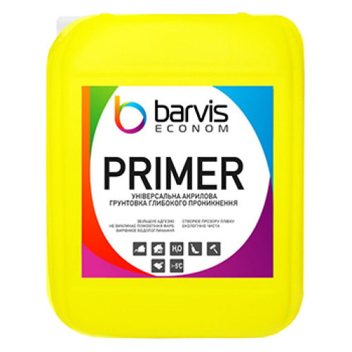Barvis Econom Primer універсальна акрилова ґрунтовка глибокого проникнення для внутрішніх та зовнішніх робіт. Використовується для підготовки основи перед нанесенням лакофарбових покриттів, штукатурки, шпаклівки, наклейки шпалер, облицювання плиткою та влаштування підлог. Глибоко проникає, вирівнює здатність поверхні, що поглинає, зміцнює неміцні поверхні, збільшує адгезію. Сфера використання: