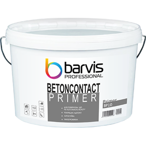 Грунтовка Barvis Primer Betoncontact для підготовки поверхонь, які не поглинають вологу в середині та зовні приміщення - монолітний бетон, бетонні блоки, перед нанесенням гіпсових та гіпсово-вапняних штукатурок. Betoncontact може служити скріплюючим ґрунтом для приклеювання плитки або інших матеріалів на кахельну плитку.