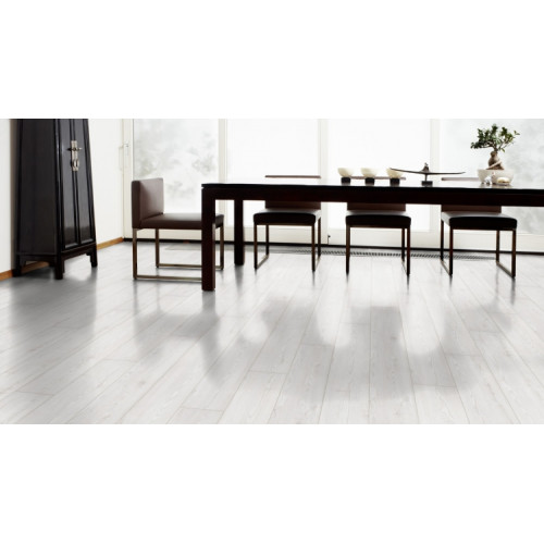 Ламинат «Сосна KODIAK» - декор молочного белого цвета. Покрытие отличается своей однородностью (незначительное количество сучков и освещенных мест), сдержанным дизайном. Удачно передает структуру натуральной сосновой доски в разрезе: имеет рельефное тиснение, дополнен трещинами и годовыми кольцами. Прекрасно сочетается со светлыми и контрастными черными, темно-коричневой мебелью, металлическими и деревянными предметами интерьера. Может использоваться совместно с системами подогрева пола.